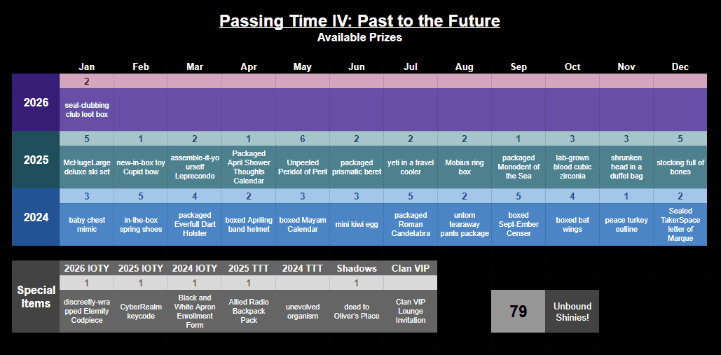 The current prize pool consists of at least one of every IOTM in our current standard set, with (in some cases) many more! The prize pool currently contains 72 unbound IOTMs, which are detailed below (and, again, largely visible in Captain Scotch's display case); click here for the source spreadsheet, for a more readable copy!